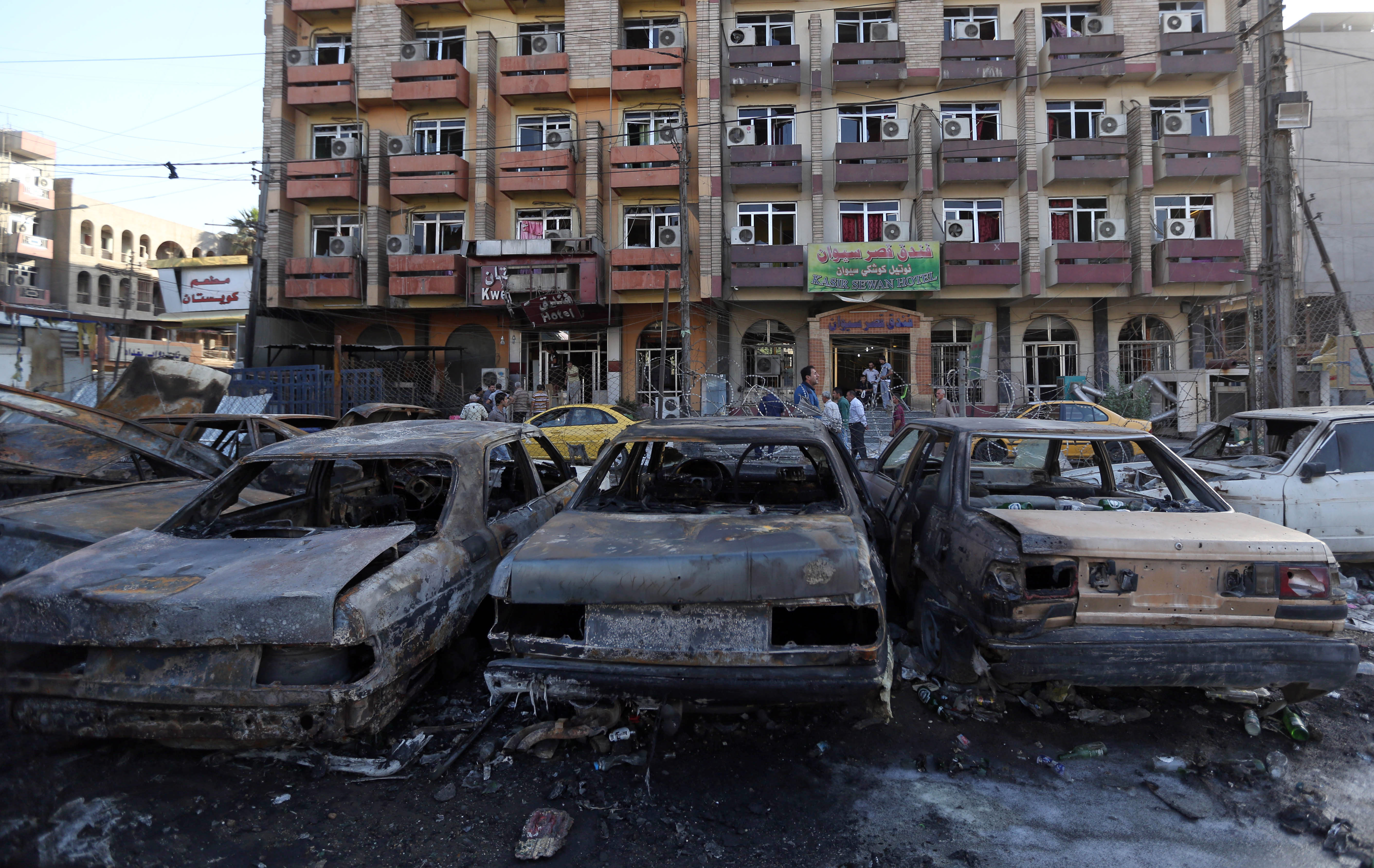 - Civilians inspect the aftermath of a car bombing near a restaurant in a commercial area of central Baghdad, Iraq, Tuesday, Sept. 29, 2015. Iraqi officials say a car bomb exploded around midnight Monday in central Baghdad killing and wounding civilians. (AP Photo/Hadi Mizban)