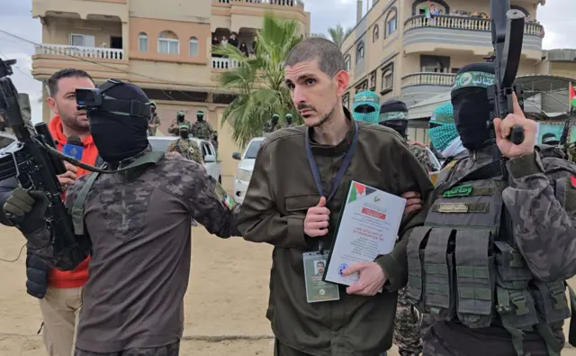 ХАМАС передал израильтян Красному Кресту в районе одиннадцати часов утра по местному времени в городе Дейр-эль-Балах в секторе Газа. Перед передачей боевики вывели заложников на трибуны. Они были одеты в коричневые брюки и рубашки, а в руках держали, судя по всему, свидетельства об освобождении. Все трое мужчин выглядели изможденно — они провели в плену 491 день.